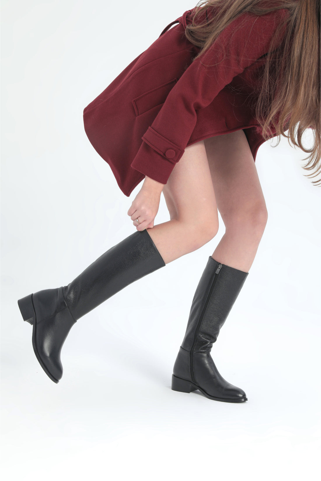 Velora Genuine Leather Flat Sole Classic Black Knee-High Boots