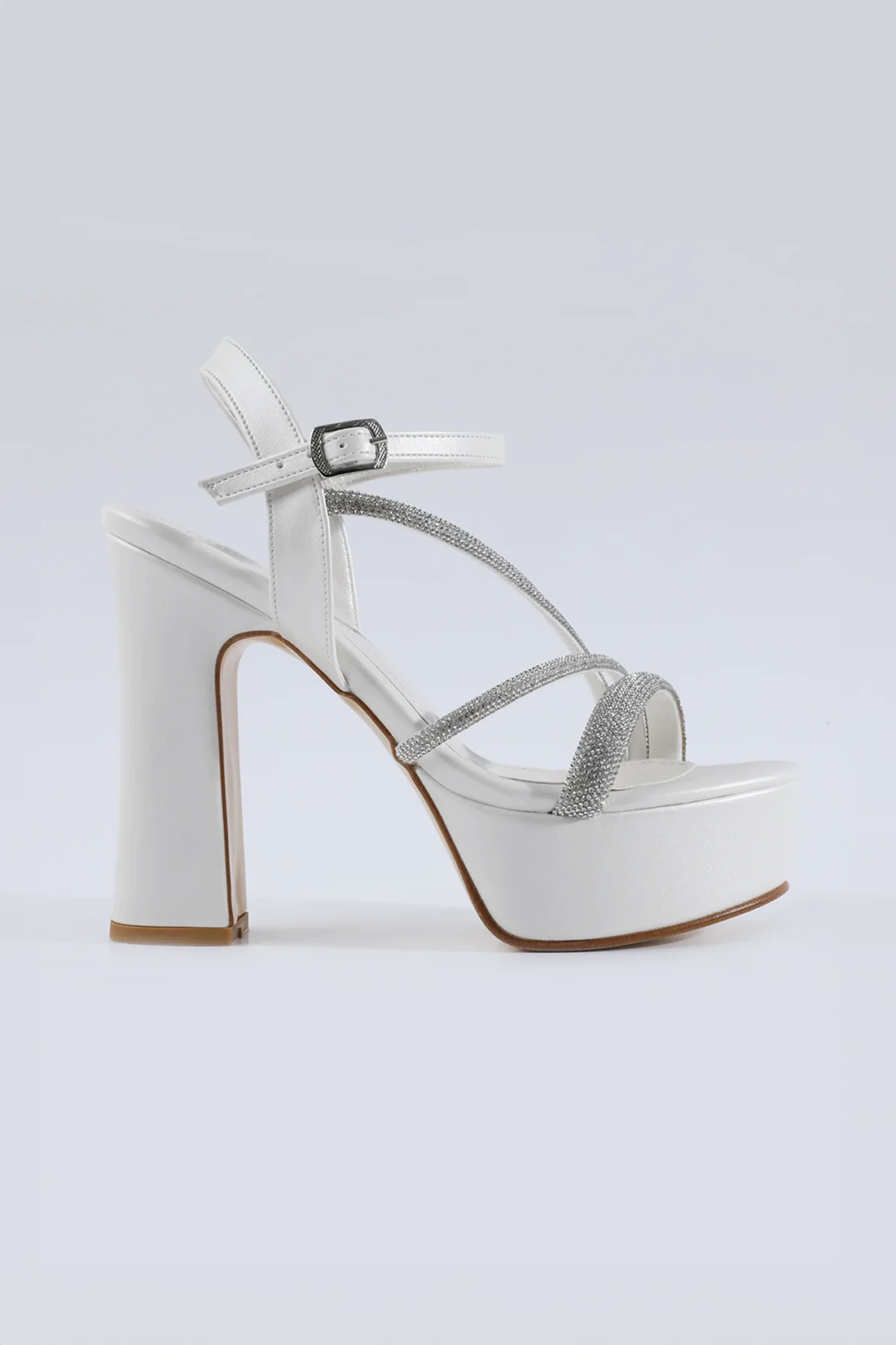 Verona Stone Embellished Crisscross Strap White Platform Heels
