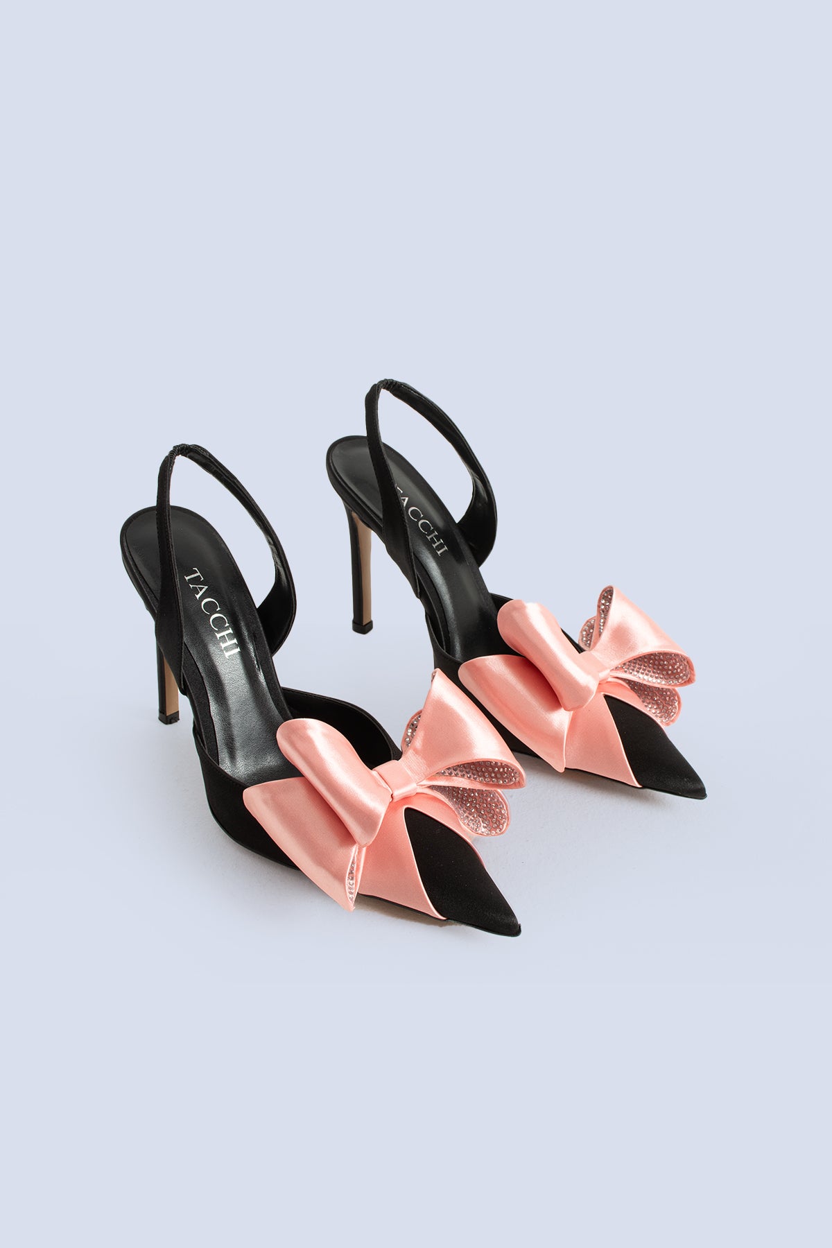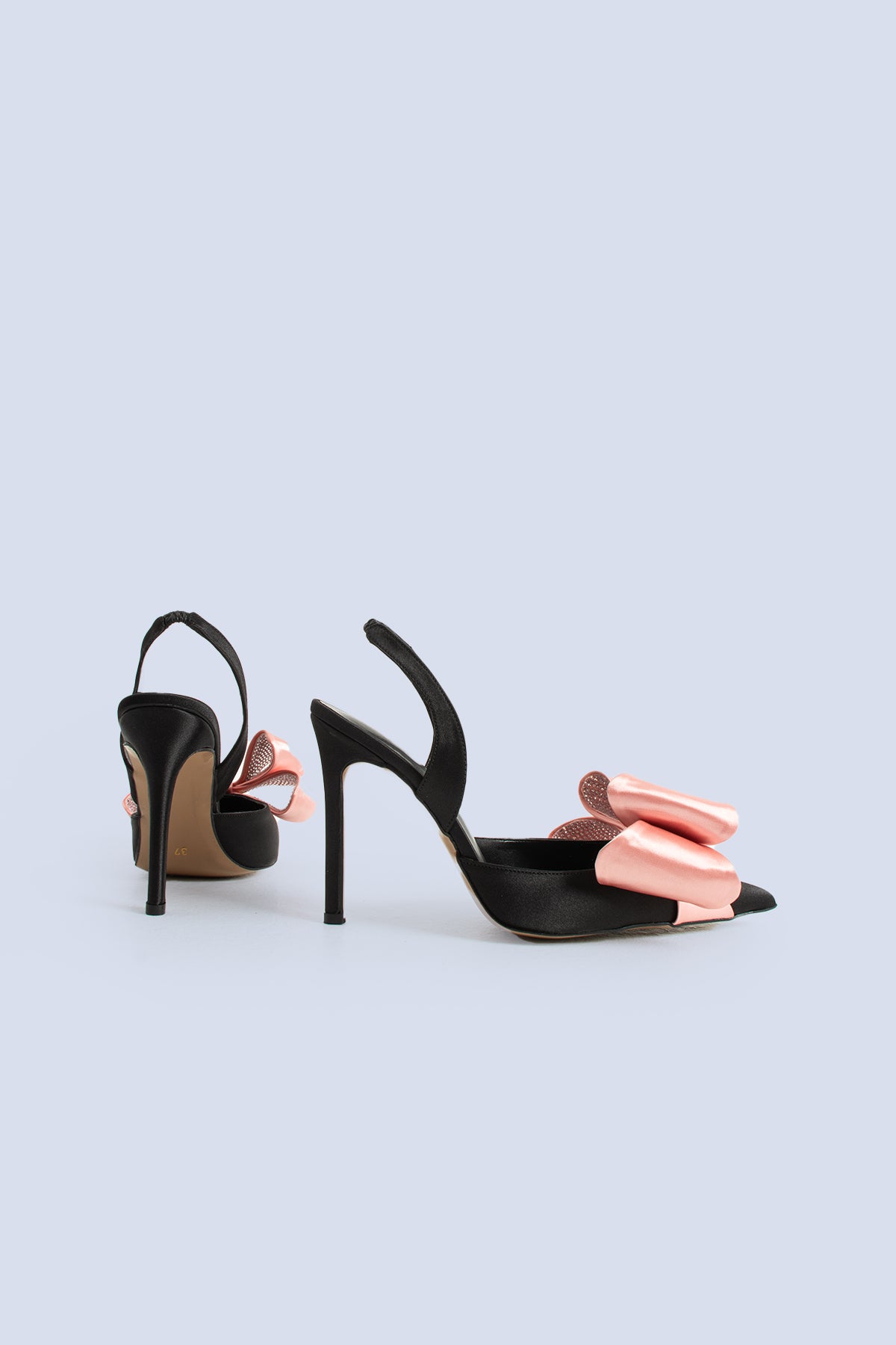 The Fame Satin Slingbacks 100 combine a modern silhouette with feminine detailing, offering an elegant option for special occasions. The smooth satin texture adds a soft sheen to the shoe’s overall form, while the double-layer blush bow positioned at the front serves as the model’s signature element. This contrast of black and blush creates both a romantic and contemporary effect, making the design versatile for a variety of formal looks.