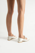 Orlina Sedef Flats, zarafetle konforu bir araya getirmek isteyen gelinler için tasarlanmış özel bir babet modelidir. Pürüzsüz saten dokusu, gelinliğin doğal ışığını yumuşak bir şekilde yansıtırken, ayak üstündeki taş işlemeli bant modern ve göz alıcı bir detay sunar. Hem sade hem de ışıltılı dokunuşları seven gelinler için ideal bir denge sağlar.